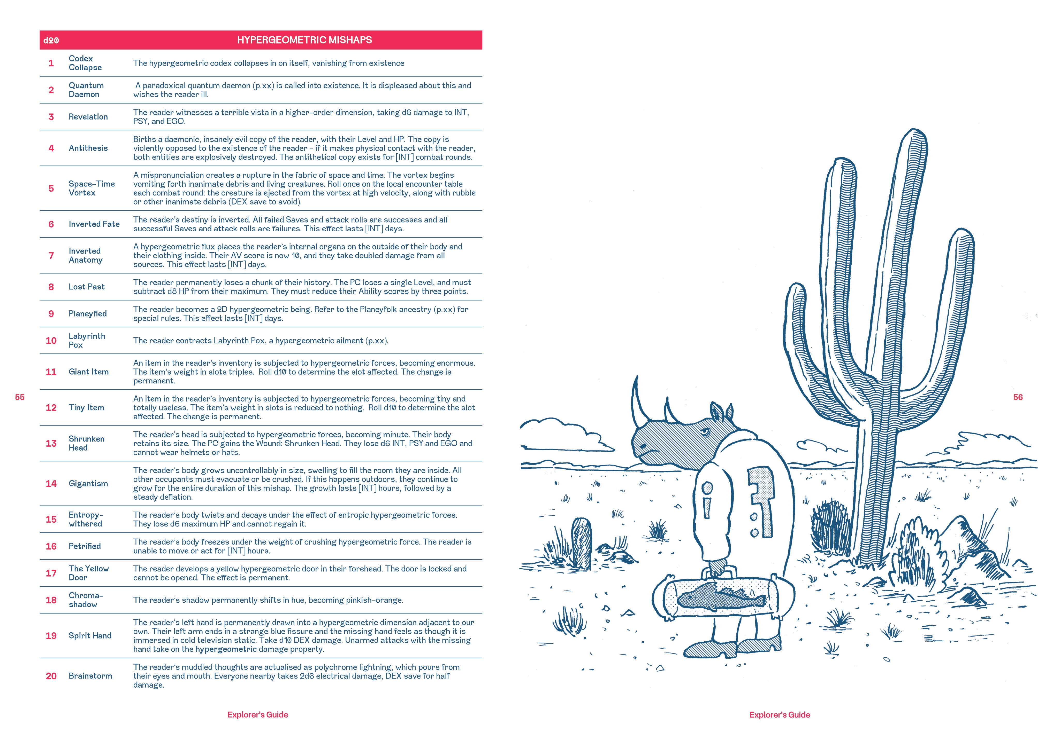 Leo: Yeah, that’s really at the heart of the game. Yoon-Suin by David McGrogan was a huge influence on me. That book taught me how tables can create a setting that’s specific and idiosyncratic, not just generic filler.